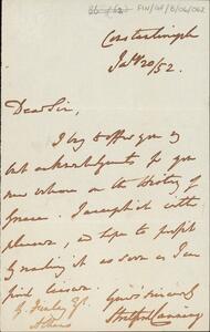 Sir Stratford Canning to George Finlay, Athens. Constantinople, 20 January 1852. Expresses gratitude for gift of George Finlay's History of Greece.