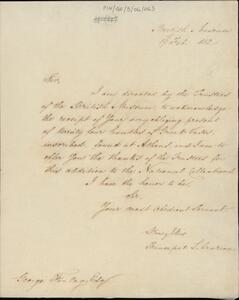 Sir Henry Ellis, Principal Librarian, to George Finlay, Athens. British Museum, 19 February 1852. Acknowledges George Finlay's gift to British Museum of 24 amphora-handles found in Athens.