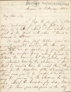 James Clyde to George Finlay. Ancona, 10 February 1854. C's experiences in Italy where he was suspect to papal and Austrian authorities by reason of rusty black garments and fiery beard and was taken for either a missonary or a Mazzinist. Returns to Scotland shortly.