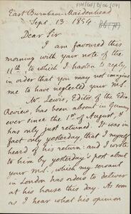 George Grote to George Finlay. East Burnham, Maidenhead, 13 September 1854. Is about to submit George Finlay's MS. to Editor of Edinburgh Review.