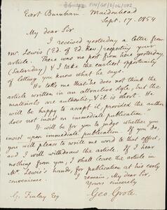 George Grote to George Finlay. East Burnham, Maidenhead, 17 September 1854. Reports that Editor of Edinburgh Review does not think George Finlay's article is written in attractive style but materials are authentic. He will accept it if George Finlay does not insist on immediate publication.