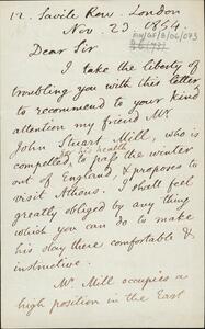 George Grote to George Finlay. 12 Saville Row, London, 23 November 1854. To introduce his friend John Stuart Mill who is to visit Athens.
