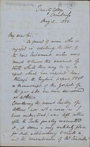 William George Clark to George Finlay. Trinity College, Cambridge, 3 May 1855. Wishes to know whether a MS. of the Gospels of 480 has been found in Athens. Hopes to visit Greece again. Is publishing book on the Peloponnese. British politics.