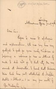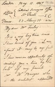 Francis C. Penrose to George Finlay. Office: Cathedral Surveyor's Office, St. Pauls House, 23 Albany Street, N.W. London, 11 May 1857. To introduce Mr. W. Burges, architect of Memorial Church at Constantinople, who is visiting Athens. Travels of R. Church and P in the Morea.