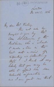 William George Clark to George Finlay. London, 22 December 1856. Introduces H. O. Coxe, Sub-Librarian of Bodleian, who is making tour in East.