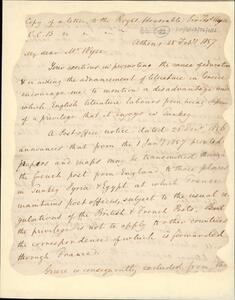 George Finlay to Sir Thomas Wyse. Athens, 25 February 1857. Requests similar postal arrangements for printed papers sent from England to Greece as between England and Turkey.