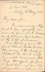 William W. Lloyd to George Finlay. 77 Snow Hill, London, E.G., 16 May 1860. Met George Finlay last autumn in Lucerne. Informs him of two restorations made by him in the eastern pediment of the Parthenon (figure of Night or Selene, charioteer of horses) and in the east pediment (statute of Nike).