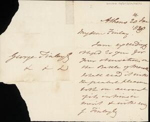 ? to George Finlay. Athens, 20 January 1840. Thanks for George Finlay's paper On the Battle of Marathon (stuck on front flyleaf of Trans. Roy. Soc. etc. see above R. 9. 2).