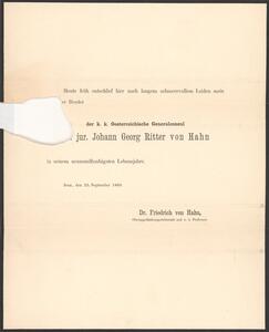 Death notice for Johann Georg Ritter von Hahn (previously loose in H's Alhanesische Studien, Vienna, 1853).