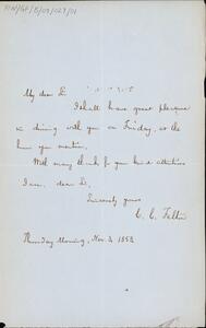 Cornelius Conway Felton to George Finlay. 3 November 1853. Thanks George Finlay for his invitation to dine (previously loose at back of G. Bancroft, History of the U.S…., Boston, 1854).