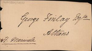 Label written by Herman Merivale with George Finlay's address (previously loose in J. P. Bellaire, Précis des opérations générales de la division française du Levant . . ., Paris, 1805.
