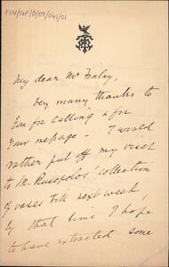 Eric Farquhar to George Finlay. 20 April 1865. Would like to delay visit to Rusopoulos's collection of vases (previously stuck on front flyleaf of J. Y. Ackerman, A Descriptive Catalogue . . . of Roman Coins, vol. 2, London, 1834).