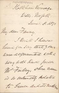 The Revd. Alexander Napier to Fanny Potterill. Holkham Vicarage, Wells, Norfolk, 8 June 1871 Requests her good offices in asking George Finlay for information on Lord Byron's last days in Greece with view to publishing translation and new edition of Karl Elze's Life of Byron (previously loose in J. Kennedy, Conversations on Religion with Lord Byron . . ., London, 1830).