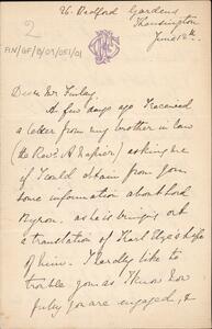 Fanny Potterill to George Finlay. 26 Bedford Gardens, Kensington, 12 June 1871. Asks if George Finlay will help A. Napier whose letter (FIN/GF/B/9/50/1) is enclosed (previously loose in J. Kennedy, Conversations on Religion with Lord Byron . . ., London, 1830).