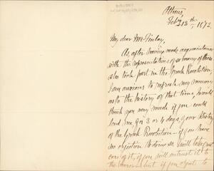Robert G. Watson to George Finlay. Athens, 12 February 1872. Has made the acquaintance of many who took part in the Greek Revolution and asks for loan of George Finlay's History of the Greek Revolution (loose at front of Charles Thomas Newton, Travels and Discoveries in the Levant, vol. 1, London, 1865).