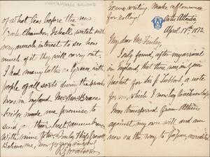 Robert G. Watson to George Finlay. On the Atlantic, 17 April 1872. Asks George Finlay to review his Handbook on Greece; is en route for Japan (loose at front of Charles Thomas Newton, Travels and Discoveries in the Levant, vol. 1, London, 1865).