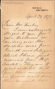 John Evans to George Finlay. Nash Mills, Hemel Hempstead, 20 April 1872. Thanks for receipt of obsidian flints found in Corinth and Salagova; comparison with Mexico and Egypt (previously stuck on front flyleaf of J. Evans, The Ancient Stone Implements . . ., London, 1872).