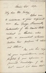 Robert Keep to George Finlay. Berlin, October 1872. To introduce George Bancroft, U.S. ambassador in Berlin, visiting Athens (stuck in front of G. Bancroft, History of the United States . . ., vol. 1, Boston, 1854).