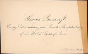 Visiting card of George Bancroft (previously loose in G. B., History of the United States . . ., vol. 1, Boston, 1854). Envelope to George Finlay stuck on inside cover and George Bancroft's visiting card loose.