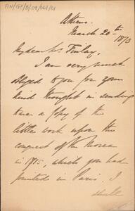 W. Stuart to George Finlay. Athens, 20 March 1873. Thanks for gift of George Finlay's book on Conquest of the Morea in 1715 (previously attached to front flyleaf of F. R. Chesney, Expedition for the Survey of the Rivers Euphrates and Tigris . . ., vol. 1, London, 1850).