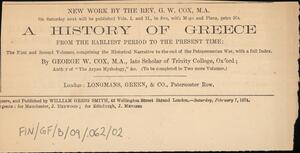 Press cutting of advertisement for A History of Greece by George W. Cox, London (previously loose in Tales of Ancient Greece by George W. Cox, London, 1872)