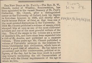 Press cutting on the new Dean of St Paul's, the Rev. R. W. Church (previously loose in G. F. Bowen, Mount Athos, Thessaly, and Epirus . . ., London, 1852.).