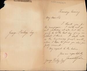 Sir George Ferguson Bowen to George Finlay. n.d. Thanks George Finlay for his book; offers to be his cicerone in Corfu ; sends copy of his recently published pamphlet (stuck on front flyleaf of G. F. Bowen, Mount Athos, Thessaly, and Epirus . . ., London, 1852.