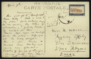 Comprises a postcard with a photograph of [an old Church/ecclesiastical building]. Mac writes that he is going to [Areopoli], mentions letters of introduction and a visit from Vivian and Theodore, and thanks Hilda for sending films and for a letter. Addressed to Hilda in Athens.