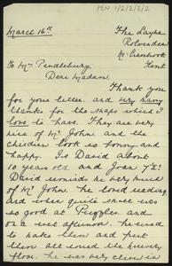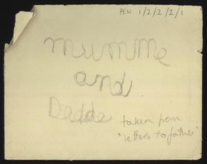 Comprises [early] childhood letters to “Dadde” telling John that he had been out for someone’s birthday and they had [ice cream], and that Joan sends love and kisses; and to “Mummie” telling Hilda that a kitten had arrived, it was black and they didn’t want a white one because it would get dirty, and that Joan sends love and kisses. With an envelope annotated as “taken from letters to father”.