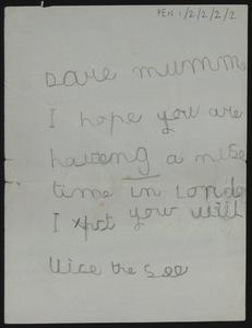 Consists of an [early] childhood letter to “Mumme” hoping that she is having a nice time in London, saying he expects [she will like the sea] and sending love to [John Pendlebury] and love from Joan.