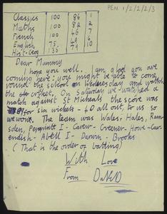 Consists of a childhood letter to “Mummy” sent from [boarding school] including a table of marks for Classics, Maths, French, English and History-Geography. Telling Hilda about a cricket match and that he was glad she was coming to visit.