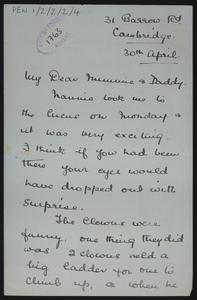 Describing a day out at the circus that “Nannie” had him David to. Sent from 31 Barrow Road, Cambridge.