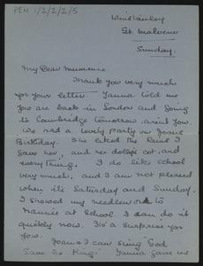 Comprises a letter to “Mummie” sent from Winstanley, Great Malvern, telling Hilda: that they had a lovely party for Joan’s birthday and that she liked her presents; that he liked school and didn’t like weekends; that he was good at needlework, and he and Joan could sing ‘God save the King’ and were given mugs with the King and Queen on by Janna; about the park and that he had an ice cream with Jonathan in the park; that he had been naughty at school; and that they were going to have a picnic with Barbara and Margaret soon. Signed by David and Joan.