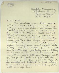 Subjects include: having just received a letter from Hilda dated February enclosing a Christmas letter from John [PEN 1/2/1/4/14]; sympathising with Hilda regarding the attack on Crete and telling her that Lieutenant Colonel J S Blunt had arrived back in Cairo from Crete and said that John was fine and enjoying himself; news [of her children] Paddy and Joan [Engelbach], and that O. [Oliver] Myers, 2nd Lieutenant Brian Emery (as a Staff Major) and R. E. Molly [or Holly?] were in Cairo; that Guy and Winnie Brunton had gone to South Africa; and measures taken at the [Cairo] Museum including Rex [Engelbach] and O Guerard taking it in turns to sleep there.