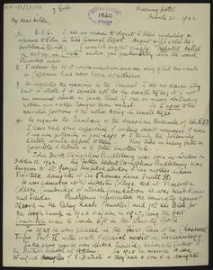Comprises a letter about various matters arising from John’s death: agreeing that the [Egyptian Exploration Society] could mention John’s death in their annual report; returning correspondence from the [War Office] establishing John’s rank as Captain; agreeing to narrative portions of a memoir about John in the Journal [of Egyptian Archaeology] being in smaller type; agreeing that the story of John’s death from [Commander Frank] Pool was correct and mentioning that when the War Office publish it Hilda should ask Bob Dixon to write to the Times newspaper; and hoping that Hilda was able to get out of civil service billeting. Also includes a draft for a memoir about John for the American branch of the [Egyptian Exploration Society], asking Hilda to approve it and add a precis.