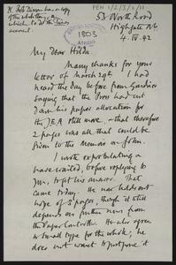 Telling Hilda he had been on a trip and that’s why he hadn’t sent a telegram, and asking her to tell Mercy [Money-Coutts] “about thirty if allowed” [?].