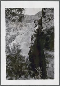 [PEN/7/2/6/283], Photograph of 2 men (one in military uniform with a gun) standing on “rock cut steps at Agios Kirkos” [Ekklisia Agios Kirikos, remains of a basilica, near Lissos archaeological site], Crete, 11 May 1935