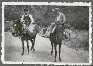 Photograph of Khroni [Bardakis] and Hilda Pendlebury near Skhinea [Skinés] riding horses (“the resurrecting mule” and “Arabella”), Crete