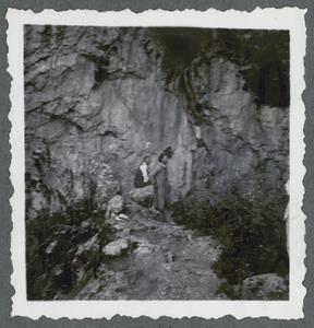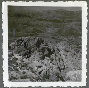Photograph of mountaineous countryside with a man and woman (unidentified) in the foreground captioned “Voutas. Site of LMIII fort near Phournakia” [Voutás], Crete