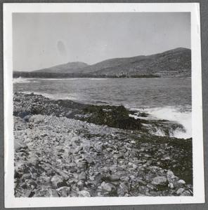[PEN/7/2/6/410], Photograph which is part (3 of 5) of a “Panorama from Stavromenos, the summit of Apendi Kavousi [Óros Thryptís Mountain]” showing the view “North West to North, Coastline of Mirabello [Merambéllou, Kólpos] continued as far as Pseira [Nisída Pse, 2 Jul 1935