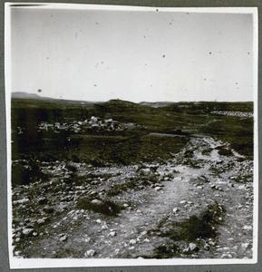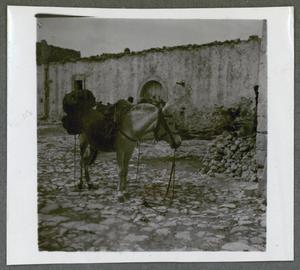 Photograph of [Khronis Bardakis] walking, Hilda Pendlebury riding a mule and another mule behind, on a path “above Apezanes” [Monastery, Moni Apezanon near Antiskari], Crete