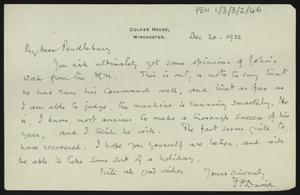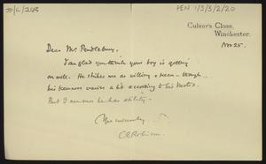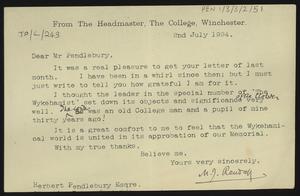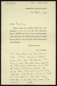 Pro forma thank you letter to [Herbert] Pendlebury for a donation to a war memorial fund, with a note from W. S. Hadley, Pembroke College Lodge