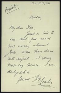 Note to [Herbert Pendlebury] from W. S. [Hadley], Pembroke College Lodge
