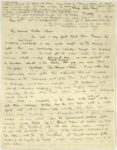 The beginning of the volume contains a section of “essays 1920” by John with comments and marks in a different hand [the book was previously used as a school book]. The essays are “The Themistocles, a newly discovered Dialogue of Plato written in a late and degraded style” (a handwritten dialogue between Eumenes and Critias) and “From the Annals of John Silent” (an essay about Oliver Cromwell). The main body of the volume is a travel-log entitled “John’s Trip to Greece with Mr Cullen, Easter 1923” comprising dated extracts of letters from John to Herbert Pendlebury about the trip (2 Apr – 4 May 1923) [copied out by Herbert Pendlebury], with small photographs [added later]. Extracts from a letter written from Athens (10 Apr) describe the journey through France (Paris), Switzerland (Lausanne), Italy (Dommodosola, Milan including the Cathedral, Lakes Como and Maggiore, plain of Lombardy, Venice), Yugoslavia (Serbia, Belgrade, South Serbia [region of Yugoslavia], Skopje), Guevgueli [Gevgelija] on the border with Greece, Salonika [Thessaloníki], Mount Olympos, the Vale of Tempe, Pelion, Ossa, Thessaly including Larissa [Lárisa], and Thermopylae [Thermopílai] (including seeing Mount Oeta). An extract also mentions a postcard from Zagreb [Croatia]. Further extracts from the letter (10 Apr) also describe arriving in Athens, going to the British School at Athens, meeting [Alan] Wace; visiting the Acropolis, the Acropolis Museum, Dipylon Gate and Cemetery and the Theseion; a day trip walking from Megara [Mégara] to Minoa and Nisaea, across Salamis [Salamís] and along the coast of Attica to Pireaus; a day trip to Prasias [modern Porto Rafti, Markopoúlou, Órmos], Laureion [Lávrion], Thorikos and walking back to Athens over Hymettos [Imittós Óros] (the trip was supposed to include Sounion but their car broke down); and climbing Lycabettos [Mount Lycabettus]. Extracts from further letters describe visiting the National Museum in Athens (including descriptions of rooms and work that Alan Wace was doing in the museum); seeing Lebadea [Levádhia], Delium, Tanagra, Thebae [Thebes], Haliartos and Goulas; travelling on to Livadhia [Levádhia], Mount Helicon, Stiris Monastery (where they ate and stayed the night), Schiste, Arracova [Arákhova], and Delphi (including descriptions of the archaeological site and museum); a boat trip to Patras [Pátrai] then travelling on to Olympia (including description of archaeological site), Anduvtiana, Greka [Graíkas], Andritsana [Andrítsiana], Bassae, Kalamata [Kalámai], Sparta, Langada Gorge, Trypi [Trípi], Mistra [Mistrás], Tripolis [Trípolis], Argos [Árgos], Tiryus, Nauplia [Náfplio], Epidauros [Epídhavros], the Heraion [of Argos], Mycenae (staying at the Belle Helene, [Alan] Wace showing them tombs, describing the archaeological sites), Corinth, Eleusis [Elefsína] and back to Athens; Marousi (climbing Pentelies); the boat journey from Pireaus, stopping in Corfu, then catching the train from Brindisi to Boulogne, and arriving back in London via Dover on the 4 May.