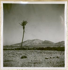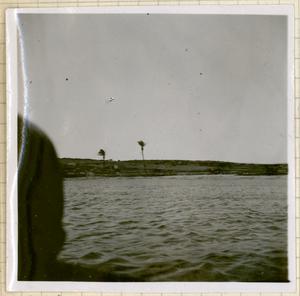 View of coastline with 2 palm trees, [taken from boat].