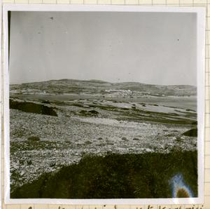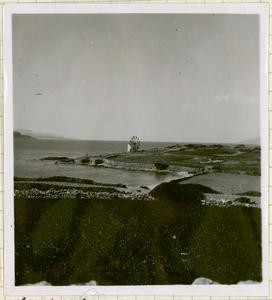 View of flat fields with walls protecting them from the sea, a windmill and the sea. [Taken on the island].
