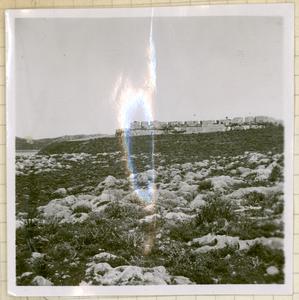 View of a rocky hill with paths and walls circling it. [Site of a fortified hill?]. Mercy-Money Coutts and Vincent Desborough visited Rhizokastellia without John Pendlebury.