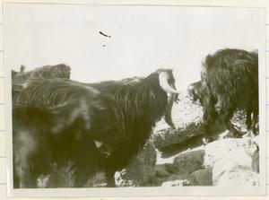 A lioness and cub are eating an [antelope] hanging from a tree.