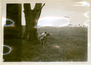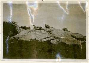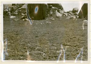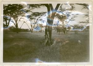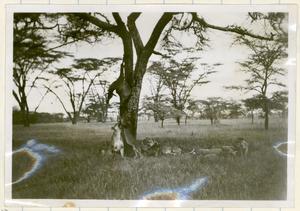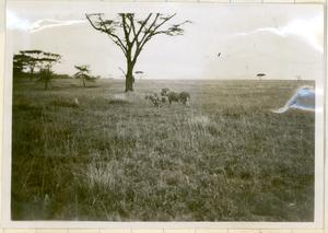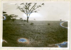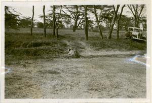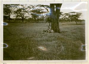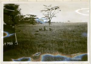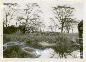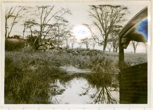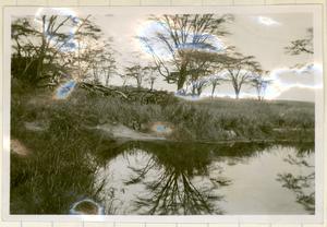 View of edge of water, possibly lions in long grass. The back of a vehicle is also in the frame.