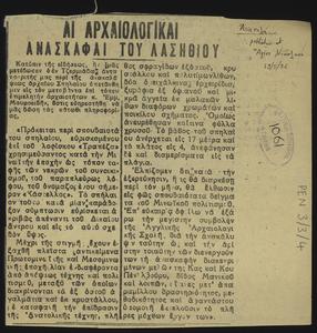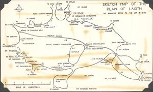 Material relating to excavations near Tzermiado, Lasíthi Plain, Crete, including Karphi. Comprises notes about test excavations, and bigger excavations at Karphi, Argoulia Cave, near Trapeza Cave, Skaphidia Cave, Kastellos, Donadhes (Lagou), Kolonna (Lagou), Kerasa, Agiou Georgiou Papoura, Sta Mnemata, Mikre Koprana, Meskine Cave, Astividhero, and Vitzelovrysis. The notes include descriptions of sites, lists of finds, and references to photographs and objects (references starting “Tz”), and are most extensive for Kastellos, Karphi and Sta Mnemata. The notebook also contains (starting from the other side of the book) rough diagrams relating to Kastellos, Skaphidia Cave, Donadhes, Kolonna, Kerasa, Papoura, Sta Mnemata, Karphi, Meskine Cave and Astividhero. The notes were written by several different people [including John and Hilda Pendlebury].